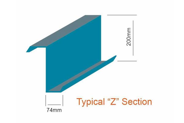 Purlins and girts are roll formed Z sections, 200 mm deep with 64 mm range shall have a 16 mm stiffening lip formed at 45° to the range. They are supported on columns, rafters or building walls. They can be lapped and nested at the supports which creates a continuous beam coagulation. They are placed on the roof and perimeter of the building. Hence they serve as a support to the roof sheeting and wall cladding.